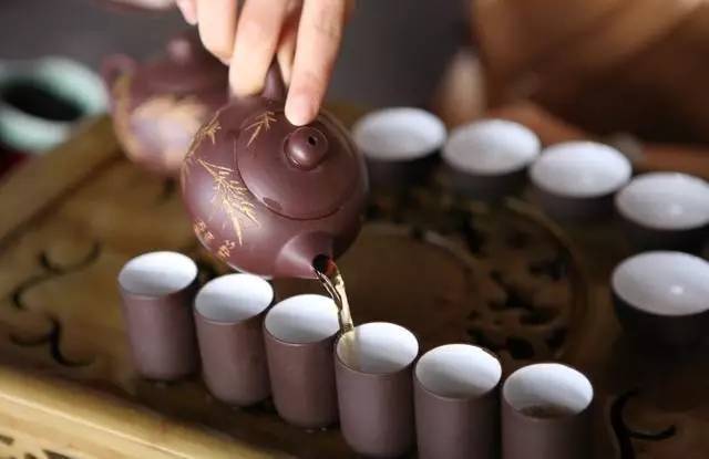 轻轻将壶中茶水倒入公道杯,使每个人都能品到色、香、味一致的茶。给人精神上的享受和感官上的刺激,简单点说就是给客人每人一杯茶。