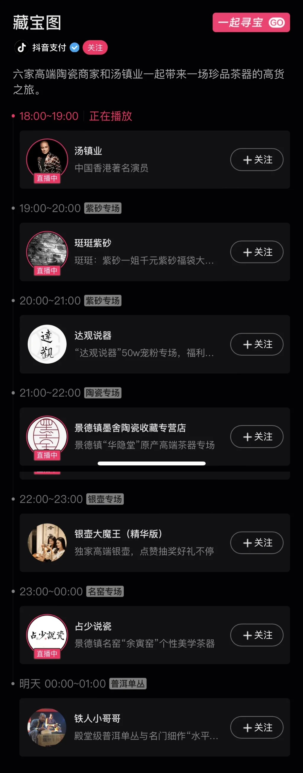 在茶器领域,「文化饮茶季」活动专门开启了「藏宝图」专场,开设“高端陶瓷馆”,邀请汤镇业及6家陶瓷商家展示陶茶的生活艺术,共同带来一场高端陶瓷线上云展会。在具体落地场景中,「藏宝图」开启了一场主题直播+六大分会场+七小时直播IP模式,利用符合时代感的装修与高端好货,进行陶瓷文化和饮茶文化双向度内容发散。除主题化的直播间外,「藏宝图」还通过连麦互动、账号联动、麦序节目单、行业频道等方式,帮助商家搭建起一个中心化阵地,通过优质内容的聚合与导流,吸引了为数众多的传统文化兴趣用户,为高端陶瓷行业积累了足量的高价值经营关系资产。